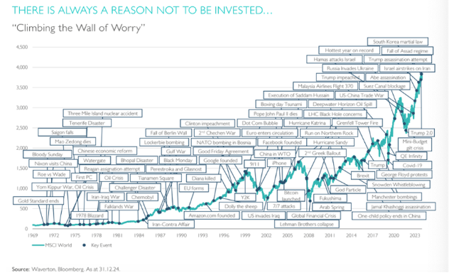 The chart below tells a powerful story. It tracks global stock markets over the last five decades, with key world events marked along the way – everything from oil crises and wars to tech bubbles, financial meltdowns and pandemics.